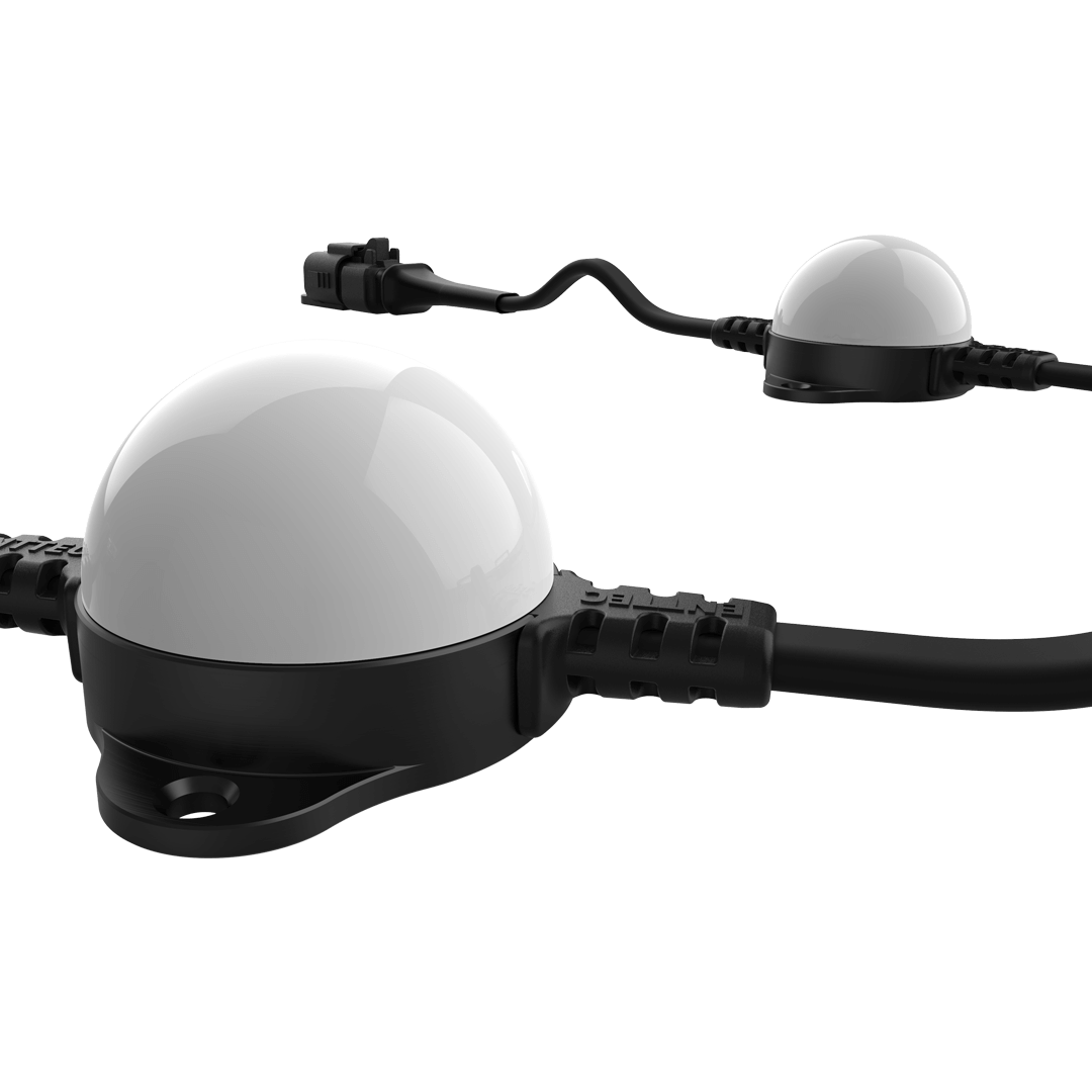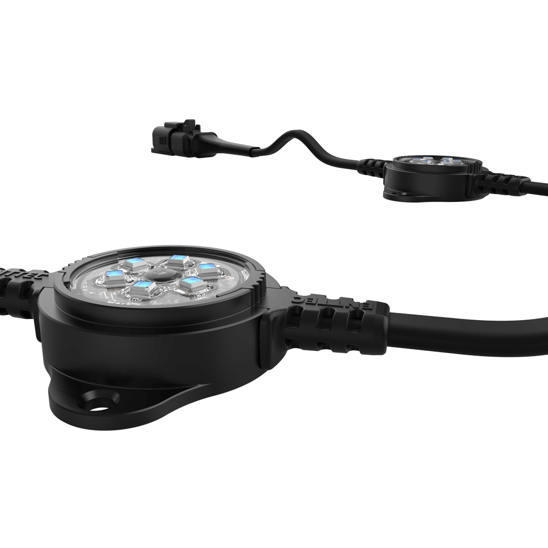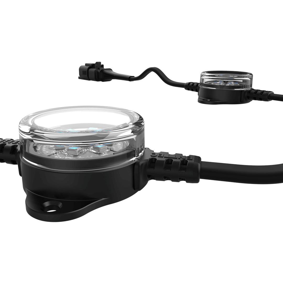 Flexible strings of ultra-bright, high-resolution 41.5mm RGB LED dots with robust, aluminum cases for all-weather use
