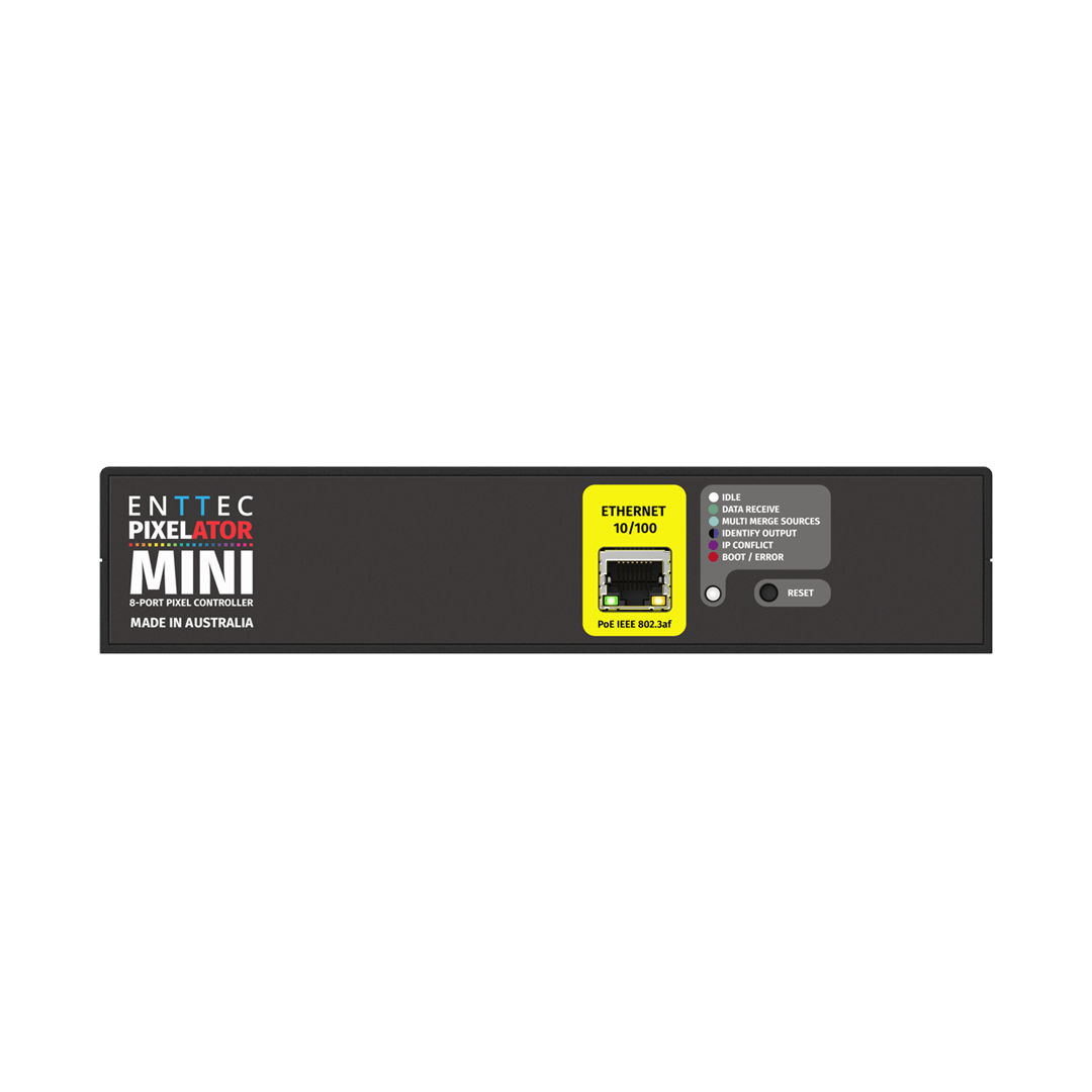 The Pixelator Mini is an installation-grade hub that simplifies LED pixel dot and strip control. As part of ENTTEC’s PLink system, it provides 8 Ethernet ports for SPI pixel conversion, handling 16 Universes (32 in overdrive mode) of Art-Net, sACN, and ESP with data integrity up to 300m.