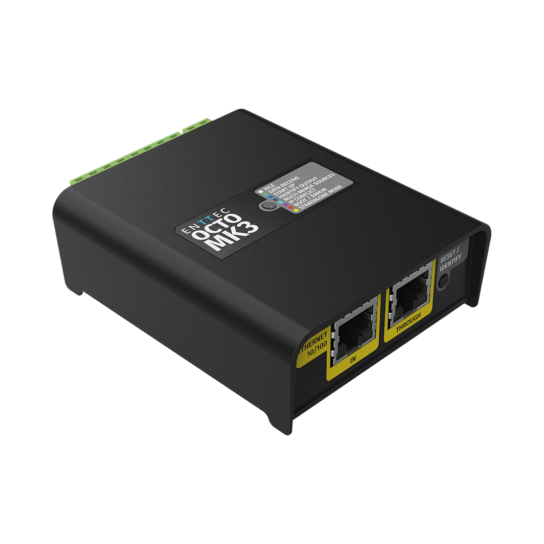 The OCTO MK3 is a powerful quad-output eDMX to LED pixel converter with overdrive mode, transmitting up to 32 universes. Robust and reliable, it connects directly to LED lights, elevating architectural, commercial, and entertainment projects. Designed for fast deployment, it supports Art-Net, sACN, ESP, and KiNet protocols, and works with over 20 industry-standard SPI LED strips.