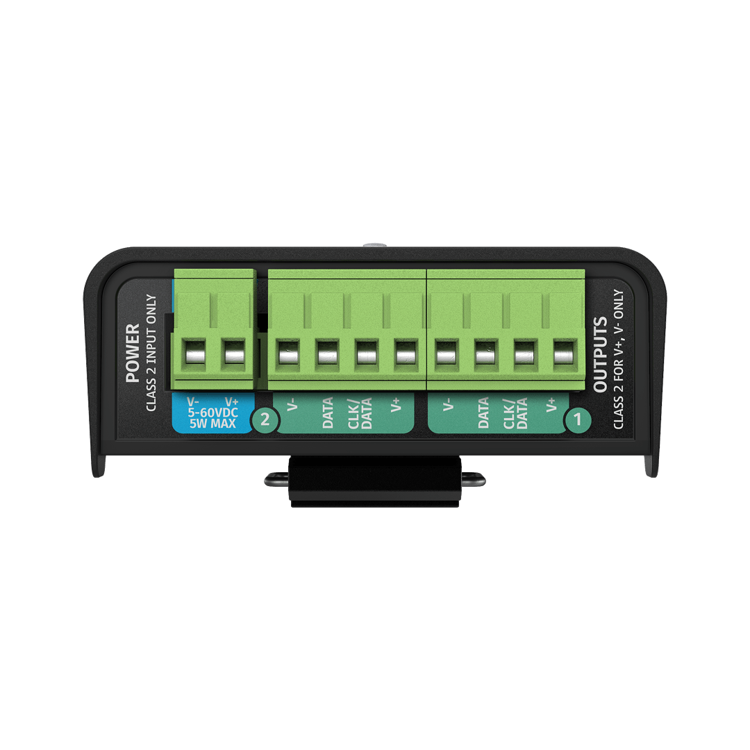 eDMX to SPI pixel controller with Standalone Mode & Overdrive feature capable of transmitting up to 32 universes of SPI data in a compact 4-module DIN-rail form factor.