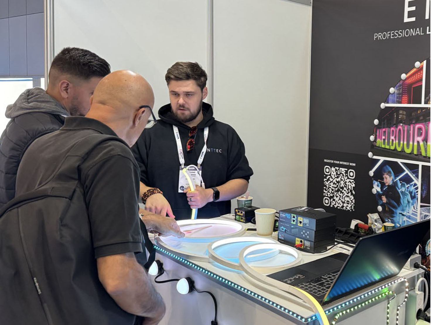 On the show floor, our booth in Hall 1 became a hub for conversation and creativity. Visitors discovered the versatility of our SMART PXL LED dots, Neon Flex, and pixel strips, alongside powerful controllers like the Pixelator Mini Mk2, Octo, and S-Play show recorders, all tied together by our award-winning ENTTEC LED Mapper (ELM) software. From compact installs to vast attractions, our end-to-end solutions were on display, designed to give designers both precision and freedom.
